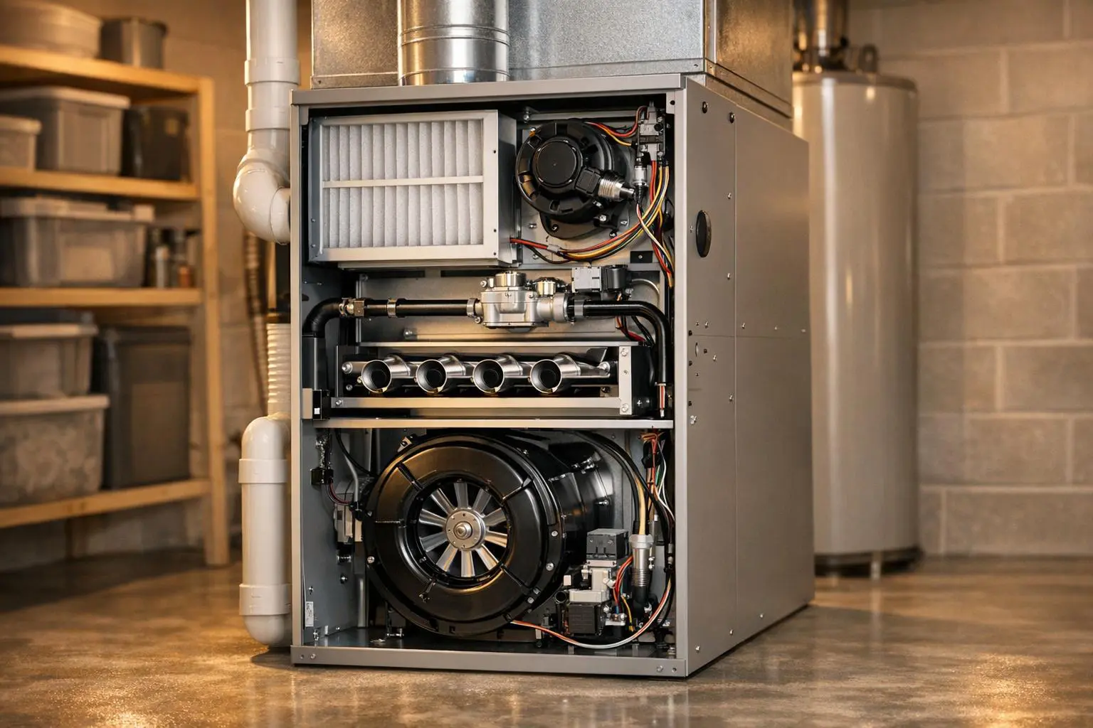 HVAC technician inspecting a gas furnace and ductwork connections in a well-lit, tidy residential basement. Highlights professionalism and expertise in HVAC services.