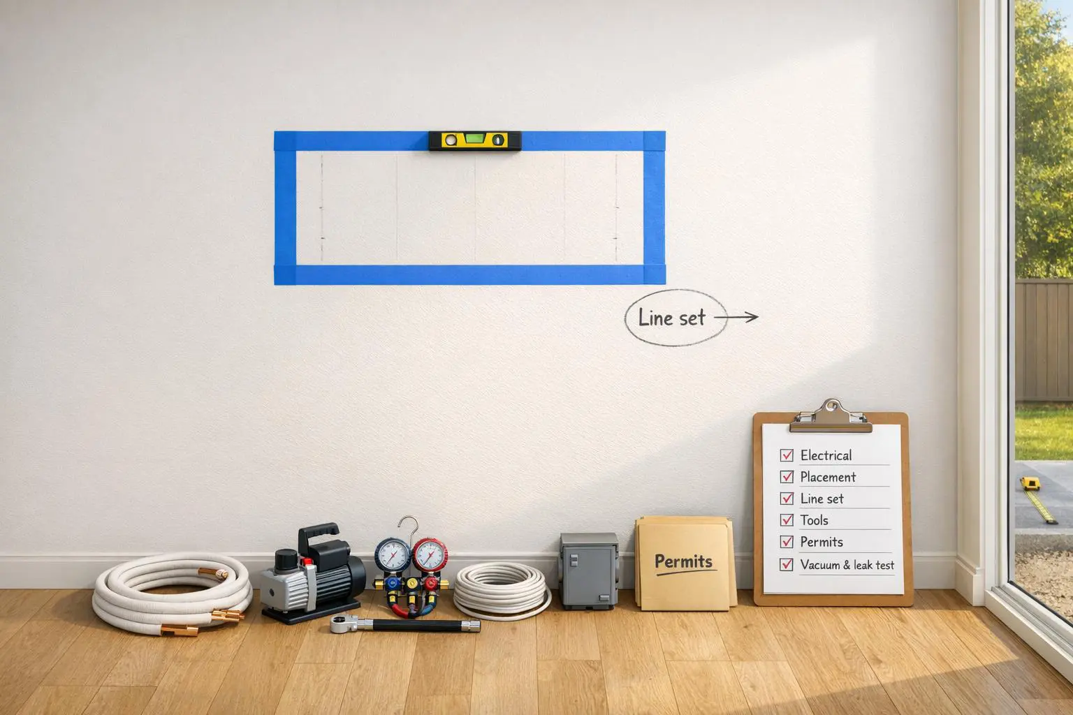 Complete pre-install checklist for mini-splits covering electrical setup, indoor/outdoor placement, line-set routing, tools, permits, and…