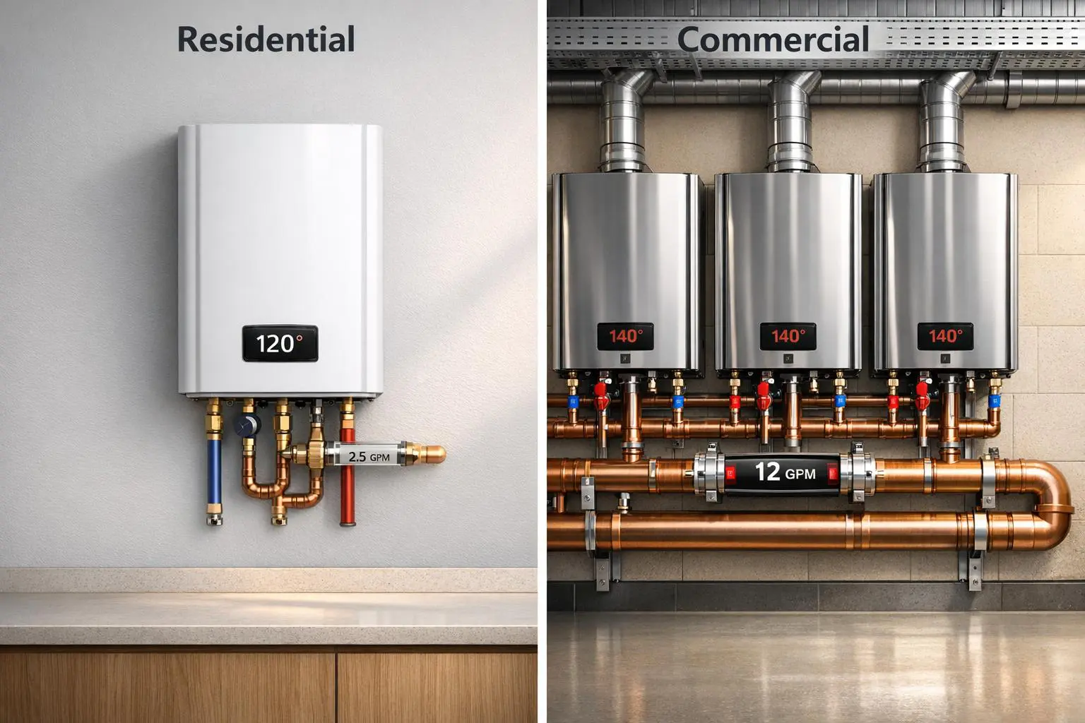 Compare residential and commercial tankless sizing: learn how to calculate GPM, temperature rise, fuel impact,…